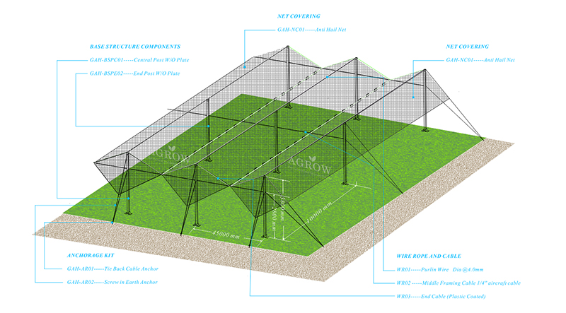 At AGROW, we offer several systems for orchard covering, from the traditional sloping system to flat system. All netting cover systems are tensile structure consisting of vertical supports connected to each other by wire rope or cable, and kept taut by tie back cable anchor and ground anchors set in the ground. The net is laid over the rows of fruit plants and secured to the structure by special hardware and accessories.